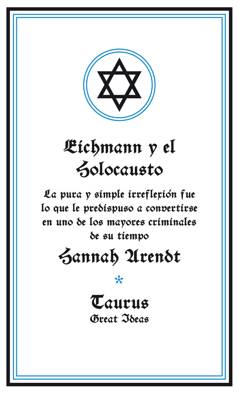 Ideas que han cambiado el mundo. A lo largo de la historia, algunos libros han cambiado el mundo. Han transformado la manera en que nos vemos a nosotros mismos y a los demás. Han inspirado el debate, la discordia, la guerra y la revolución. Han iluminado, indignado, provocado y consolado. Han enriquecido vidas, y también las han destruido. Taurus publica las obras de los grandes pensadores, pioneros, radicales y visionarios cuyas ideas sacudieron la civilización y nos impulsaron a ser quienes somos. Inspirada por el juicio a un burócrata que contribuyó a provocar el Holocausto, esta obra fundamental sobre la banalidad del mal asombró al mundo con su análisis de la ceguera moral de un régimen y de la insistencia de un hombre en ser absuelto de toda culpa porque «sólo cumplía órdenes». Comentarios sobre la colección Great Ideas: «De veras que la edición es primorosa y pocas veces contenido y continente pueden encontrarse mejor ensamblados y unidos. ¡Qué portadas! Para enmarcar. [...] Ante las Great Ideas, solo cabe quitarse el sombrero. ¡Chapeau!» ABC «Taurus propone un doble envite con este lanzamiento. Por un lado aumenta su compromiso con el ensayo; por otro, recupera el gusto por la estética. A los volúmenes se les ha proporcionado una portada delicada y cuidada (copian el original británico) que invita a la lectura.» La Razón «Un fenómeno editorial.» The Guardian «Aparte de los contenidos, en general muy bien elegidos, son tan bonitos que si los ven seguro que cae alguno.» El País «Ideas revolucionarias, crónicas de exploraciones, pensamientos radicales... vuelven a la vida en estas cuidadísimas ediciones, muy atractivas para nuevos lectores.» Mujer Hoy «Grandes ideas bien envueltas. De Cicerón a Darwin, esta colección entra por los ojos.» Rolling Stone «Original y bella iniciativa la emprendida por Taurus con su colección Great Ideas.» Cambio 16 «Hay libros inmortales, libros únicos que contienen pensamientos y reflexiones capaces de cambiar el mundo, tesoros en miniatura reagrupados en la colección Great ideas.» Diario de León
