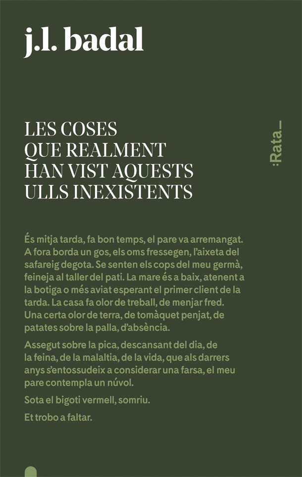 Hi ha una nit immensa i sense estructura. Però s'apostrofa amb el nostre cor. És mitja tarda, fa bon temps, el pare va arremangat. A fora borda un gos, els oms fressegen, l'aixeta del safareig degota. Se senten els cops del meu germà, feineja al taller del pati. La mare és a baix, atenent la botiga o més aviat esperant el primer client de la tarda. La casa fa olor de treball, de menjar fred. Una certa olor de terra, de tomàquet penjat, de patates sobre la palla, d'absència. Assegut sobre la pica, descansant del dia, de la feina, de la malaltia, de la vida, que als darrers anys s'entossudeix a considerar una farsa, el meu pare contempla un núvol. Sota el bigoti vermell, somriu. Et trobo a faltar.