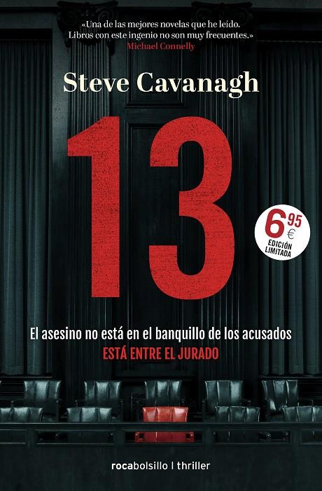 EL ASESINO NO ESTÁ EN EL BANQUILLO DE LOS ACUSADOS,ESTÁ ENTRE EL JURADO.MÁS DE 250.000 EJEMPLARES VENDIDOS.EL THRILLER LEGAL DEL QUE TODO EL MUNDO ESTÁ HABLANDO.«A su entender, ¿hay algún impedimento para que usted forme parte de este jurado?»El asesinato no fue la parte más complicada. Fue tan solo el inicio del juego.Joshua Kane se ha estado preparando toda su vida para este momento. Ya lo había hecho antes, pero esta vez será la más importante.Este es el juicio por asesinato del siglo, y Kane ha asesinado para obtener el mejor asiento en la sala.Pero hay alguien al acecho, alguien que sospecha que el asesino no es el acusado.Kane sabe que el tiempo se agota y lo único que quiere es el veredicto de la condena antes de ser descubierto.13 RAZONES POR LAS QUE DEBES LEER ESTE LIBRO«El John Grisham para una nueva generación.» Sarah Pinborough«Cavanagh es de lo mejor del momento. Créanme.» Lee Child«Inteligente y original. Qué maravilla de libro.» Clare Mackintosh«Gran libro. Engancha. 13 es realmente adictivo.» Simon Kernick«Un thriller lleno de giros brillantes.» Ruth Ware«Un viaje absolutamente compulsivo.» Michael Connelly«Sencillamente merece ser un gran best seller.» Mark Billingham«Cavanagh es, sin duda, el mejor escritor de trhillers legales de nuestros días.» Craig Sisterson«Este libro es simplemente espectacular.» Emma Kavanagh«Fantástico, cautivador. Culpable de todos los cargos.» Angela Clarke«Un éxito absoluto. Maravilloso.» Susi Holliday«Una brillante manipulación al lector.» Mason Cross«Una montaña rusa repleta de giros adictivos. Impresionante.» Cass GreenLO QUE HAN DICHO EN ESPAÑA DE LA NOVELA:«Novela de tribunales y asuntos legales que se vuelve sorpresiva por momentos. Con un abogado poco escrupuloso, Eddie Flynn, y de curiosa e´tica. Para pasar un buen rato.» Babelia, El País«Una novela negra que hará disfrutar a los amantes del género. Diferente, pero con todas las esencias de un thriller redondo.» Blog novela negra y policíaca«Steve Cavanagh, emergente maestro del suspense capaz de colar en un jurado neoyorquino a un asesino en serie que trata de absolverse de sus crímenes.» Miguel Lorenci, Las Provincias«Ingenioso, retorcido y emocionante. Pura dinamita. Declaramos a Steve Cavanagh culpable en primer grado de escribir un thriller brillante y adictivo.» Edición original«Hacía tiempo que no disfrutaba tanto con un libro de este género.» Galaxia Bidena«Os atrapará con su intensidad en los interrogatorios, las investigaciones imposibles y los momentos de tensión.» Fantasymundo «Un thriller interesante, bien construido, con personajes complejos con personalidad propia, giros en la trama y final impredecible.» Salamandra negra«Steve Cavanagh no deja un cabo suelto, nos deja con ganas de más, y estamos deseosas de conocer un poco más a Eddie Flynn.» Qué bello es leer