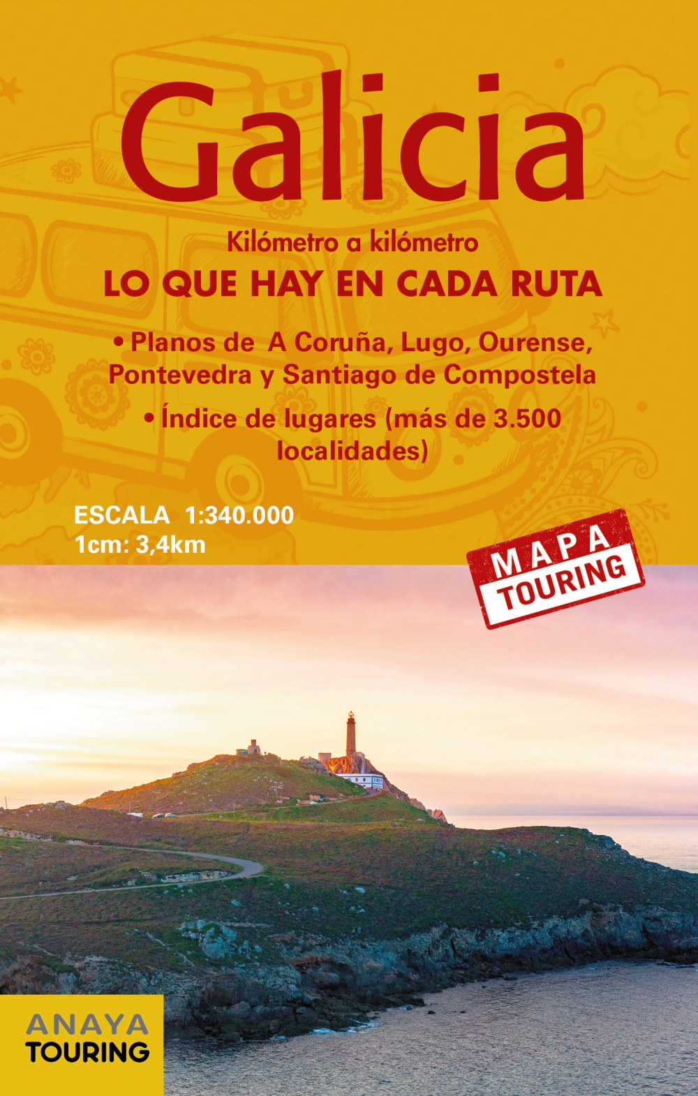 Galicia. Mapa turístico de carreteras, escala 1:340.000. Comprende las carreteras de la comunidad de Galicia e incluye los planos de las cuatro capitales de provincia (A Coruña, Lugo, Ourense y Pontevedra) y Santiago de Compostela, y toda la información viaria y turística para viajar por la Comunidad (vistas panorámicas, castillos, monumentos, paradores, playas, recorridos pintorescos, áreas naturales protegidas...). También incorpora un índice de localidades.