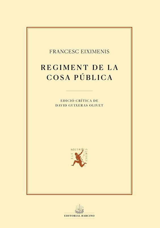 El Regiment de la cosa pública és el tractat polític que Francesc Eiximenis va dedicar als jurats de la ciutat de València el 1383. Sintetitza les idees polítiques d’Eiximenis relatives al govern de l’estat i, en particular, de la ciutat i és una obra fonamental en la configuració del sistema del pactisme català. Aquesta és la primera edició crítica del Regiment feta directament des del millor manuscrit conservat.