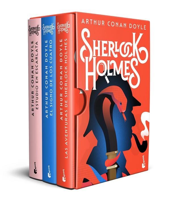 El estuche contiene los libros Estudio en Escarlata, El signo de los cuatro y Las aventuras de Sherlock Holmes.