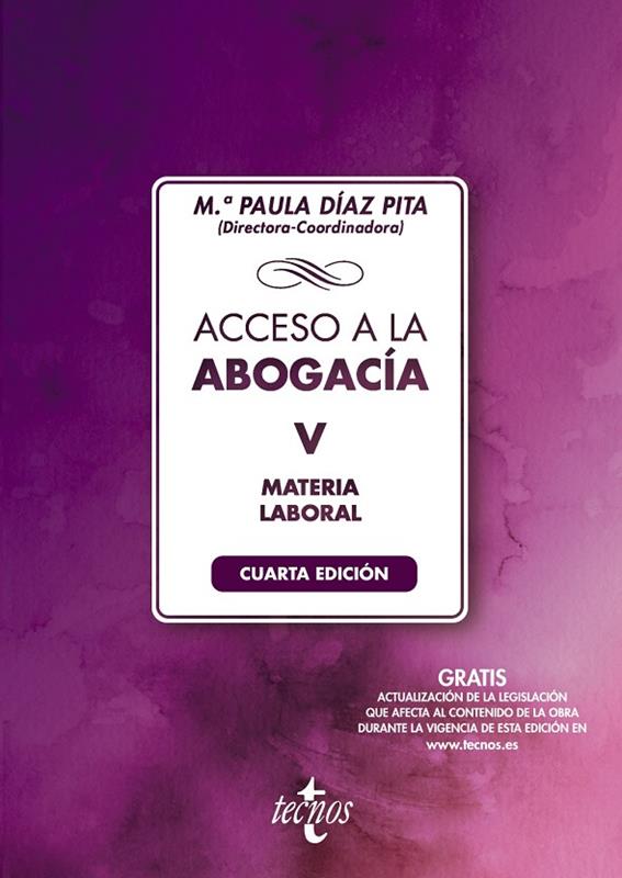 El tomo V de Materia Laboral, cuarto de los tomos de Materias específicas, desarrolla en 20 temas la materia laboral, dentro de la cual figuran temas de Derecho laboral y temas de Derecho procesal laboral, de tal manera que los aspirantes disponen del material que les permite preparar adecuadamente la segunda parte de la prueba de acceso a la abogacía, pudiendo elegir esta especialidad jurídica entre las cuatro posibles. Con absoluto rigor se ha respetado el orden y rúbrica oficial de los temas de la convocatoria, de tal manera que el contenido de todos ellos facilita a los aspirantes poder encontrar en este tomo V el material necesario y completo para responder adecuadamente a las 25 preguntas de la segunda parte de esta prueba.