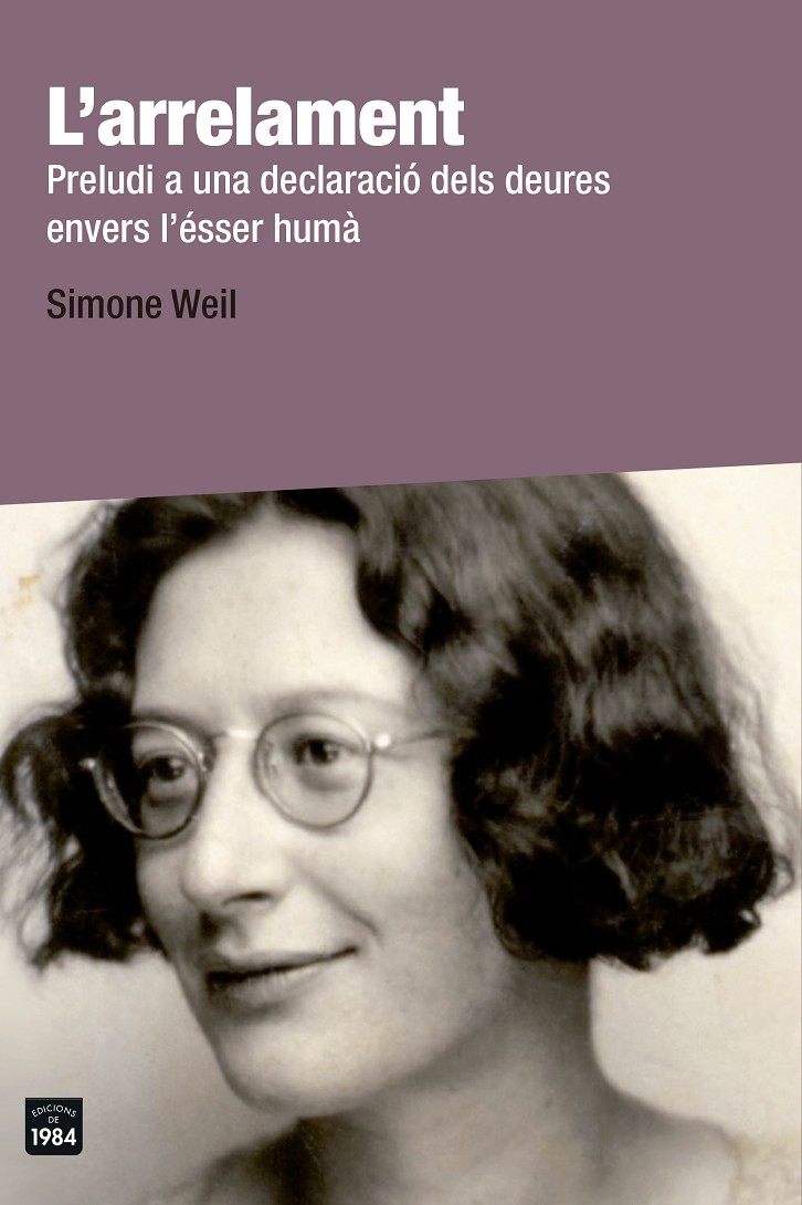 Desconcertant Simone Weil (1909-1943), discordant, franctiradora, cantelluda, pristina en les anàlisis, implacable, sempre al costat dels desgraciats i els perdedors, adscrita voluntàriament a la humiliació, sense cap acomodació amb el poder, cap pacte. La seva obra refusa qualsevol assimilació: ni l’Església —tot i el seu misticisme— ni cap ideologia no se n’han pogut aprofitar. L’arrelament s’estavella contra una realitat social allunyada del consol i s’hauria de llegir i repensar per motius d’urgència política. Entre les obres de Simone Weil, cal destacar, a part de L’arrelament, diversos llibres escrits durant la seva curta vida (va morir als trenta-tres anys i mig): En espera de Déu, Pensaments desordenats, La gravetat i la gràcia, Autobiografia espiritual, Escrits polítics i La Ilíada o el poema de la força, entre d’altres.