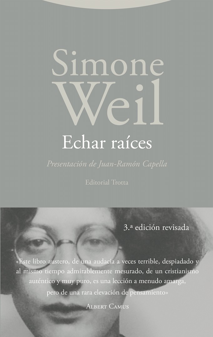 «Echar raíces quizá sea la necesidad más importante e ignorada del alma humana. Es una de las más difíciles de definir. Un ser humano tiene una raíz en virtud de su participación real, activa y natural en la existencia de una colectividad que conserva vivos ciertos tesoros del pasado y ciertos presentimientos de futuro. El ser humano tiene necesidad de echar múltiples raíces, de recibir la totalidad de su vida moral, intelectual y espiritual de los medios de que forma parte naturalmente.» (Simone Weil) «Salgo de viaje y llevo conmigo Echar raíces. Vuelvo a casa con ese libro incomparable leído de principio a fin una vez más y lo primero que hago es empezar de nuevo La gravedad y la gracia, donde encuentro los subrayados y las anotaciones de anteriores lecturas». (Antonio Muñoz Molina) «L'Enracinement es, con las Leyes y la Política platónicas, y alguno de los mejores frutos de la literatura utópica, una de las obras políticas más difíciles de soportar para el sentido común». (Manuel Sacristán Luzón) «Este libro pertenece a esa categoría de los prolegómenos de la política que los políticos raramente leen, y que muchos de ellos difícilmente podrían comprender ni sabrían cómo aplicar». (T. S. Eliot) «No estamos realmente ante un idealismo ético, sino ante un minimum realista para una sociedad en la que el hombre cuente». (José Jiménez Lozano)